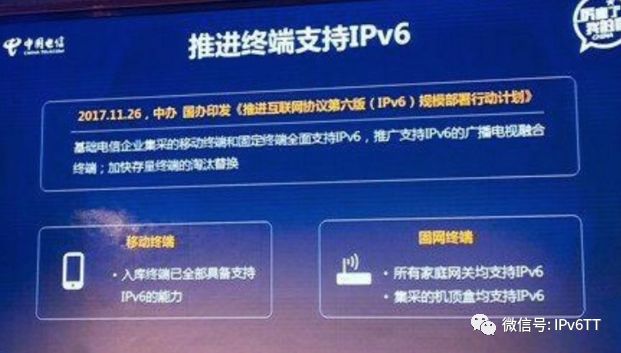 2018年5月17日,中国电信召开 “中国电信AI终端白皮书发布”,中国电信集团市场部副总经理陆良军介绍了落实IPv6规模部署行动计划的重点举措。据悉,中国电信将推动云、管、端、业务应用全面支持IPv6。
